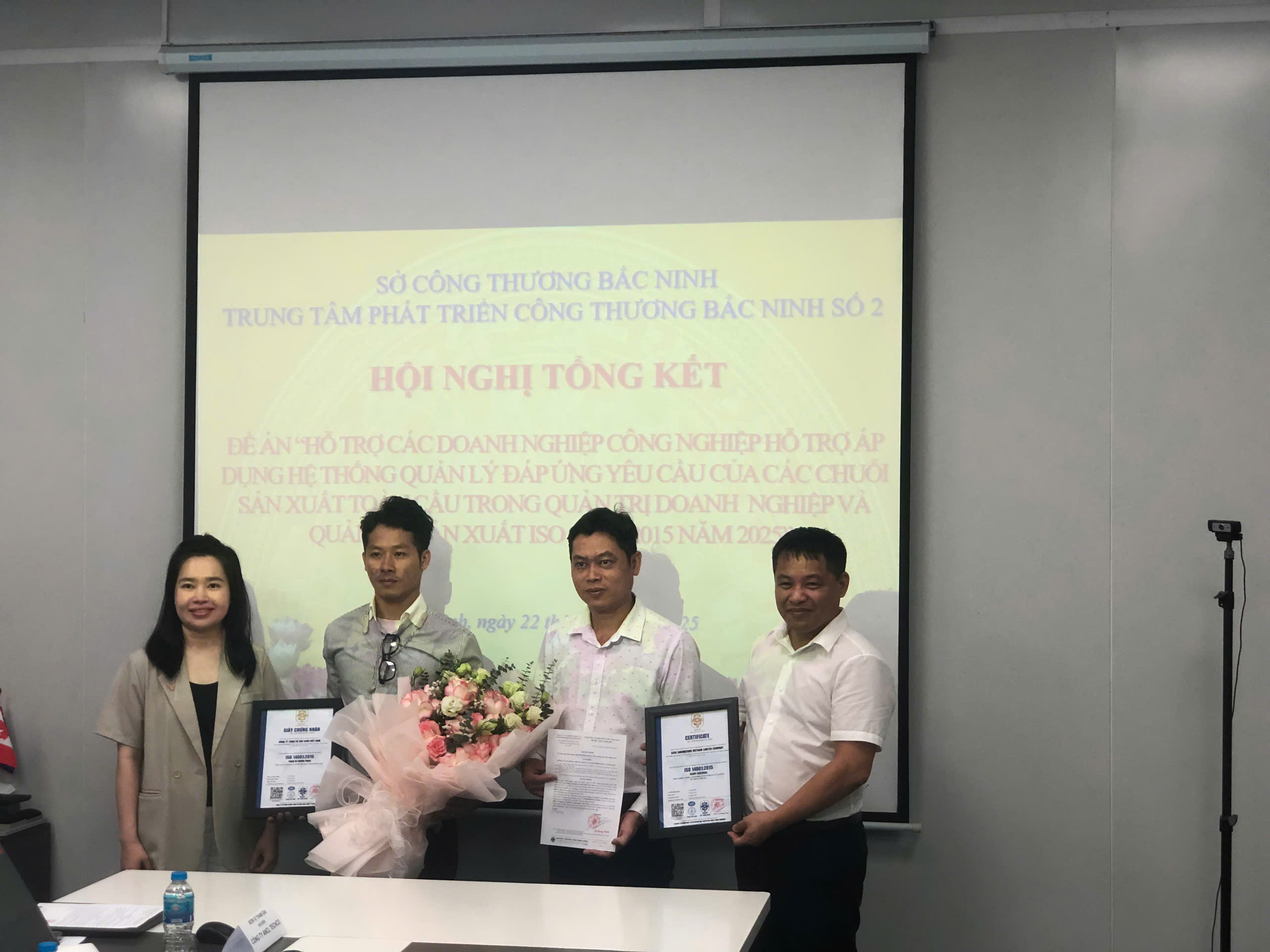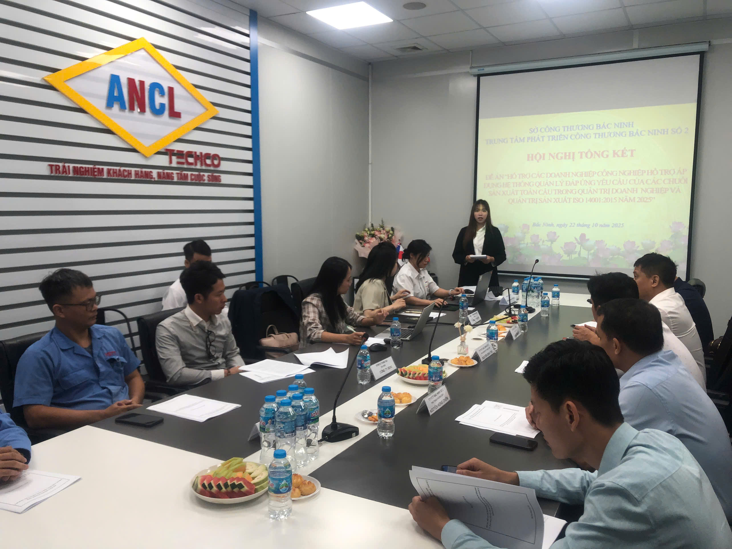 Ngày 22/10/2025, Tại Công ty TNHH ANCL Techco (Lô F2, đường N3-2, KCN Đại Đồng, xã Đại Đồng, tỉnh Bắc Ninh), Trung tâm Phát triển công thương Bắc Ninh số 2 đã phối hợp với Công ty Cổ phần giám định và chứng nhận quốc tế ISOCERT tổ chức Hội nghị tổng kết đề án "Hỗ trợ các doanh nghiệp công nghiệp hỗ trợ áp dụng hệ thống quản lý đáp ứng yêu cầu của các chuỗi sản xuất toàn cầu trong quản trị doanh nghiệp và quản trị sản xuất ISO 14001:2015" và trao giấy chứng nhận ISO 14001:2015 cho 03 doanh nghiệp tham gia đề án. Hội nghị có sự góp mặt của đại diện Sở Công Thương, Trung Tâm Phát triển công thương Bắc Ninh số 2, Công ty Cổ phần giám định và chứng nhận quốc tế ISOCERT, các doanh nghiệp và cơ quan báo chí chính thống